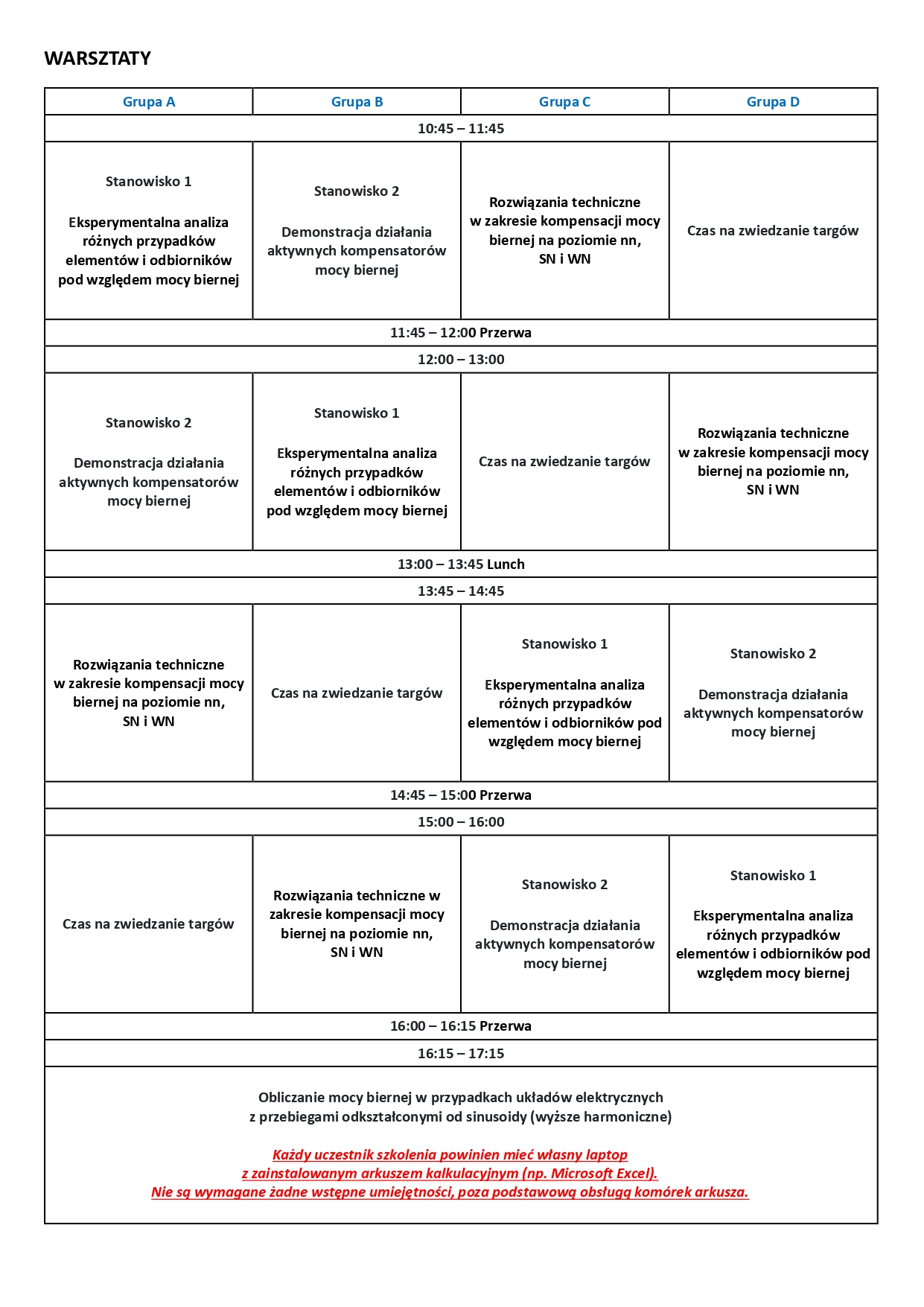Wprowadzenie do tematu szkolenia. Teorie mocy i energii biernej – interpretacje fizyczne. Energia bierna w przedsiębiorstwie i energia bierna w sieciach elektroenergetycznych. Wpływ energii biernej na straty energii elektrycznej. Wpływ mikroinstalacji prosumenckich na problemy związane z energią bierną. Pomiary i interpretacja wyników pomiarów mocy i energii biernej. Sposoby kompensacji mocy biernej. Ustawy, rozporządzenia, normy, instrukcje ruchu i eksploatacji oraz taryfy dla usług dystrybucji energii elektrycznej w kontekście mocy i energii biernej. Dyskusja różnych przypadków konsekwencji finansowych i ekonomicznych wynikających z energii biernej. Dyskusja różnych przypadków zarządzania i gospodarowania energią bierną w ujęciu technicznym, prawnym i ekonomicznym.