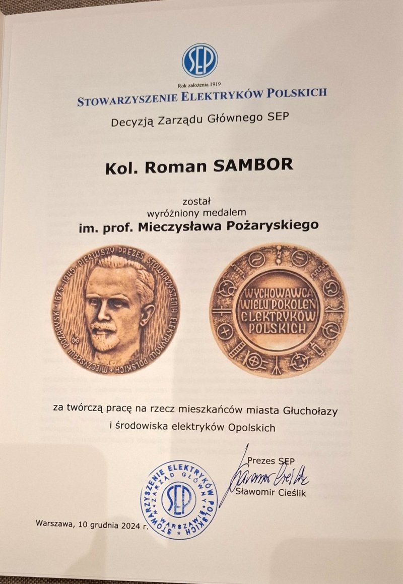 także członek Zarządu Oddziału Opolskiego SEP) kol. Romana Sambora „Medalu im. prof. M. Pożaryskiego”. GRATULACJE !