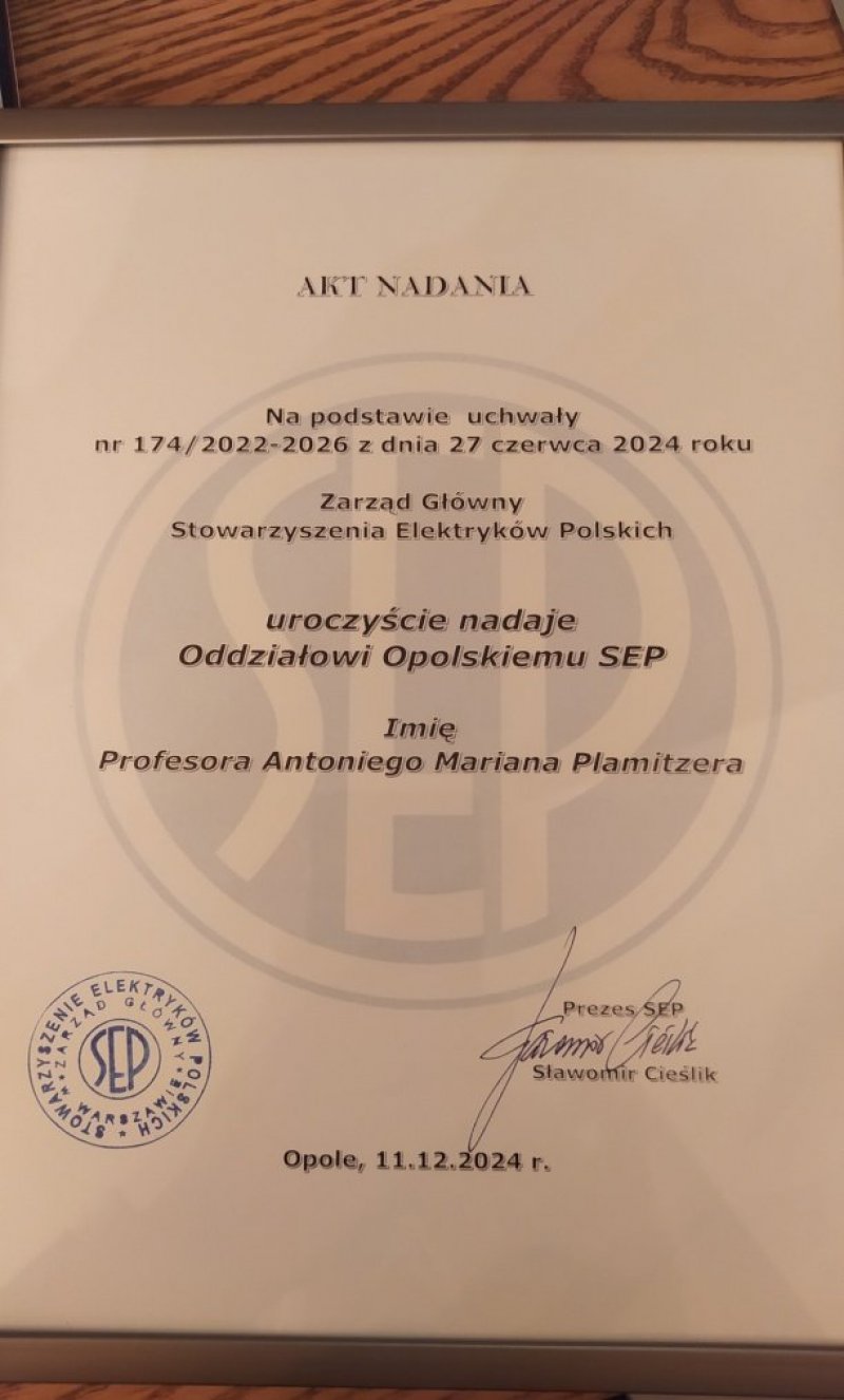 które uświetniła osoba prezesa SEP Sławomira Cieślika, a związane było to z aktem nadania Oddziałowi Opolskiemu SEP imienia profesora Antoniego Mariana Plamitzera (relacja w TwS nr 462). To także otrzymanie przez „naszego” członka Koła SEP nr 28 Ziemi Nyskiej (członek Zarządu Koła,