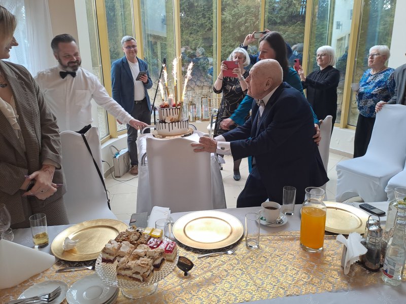 Wspaniała uroczystość, na którą zaproszeni zostali przedstawiciele Naszego Oddziału odbyła się w dniu 09.03.2025 r. w pięknej Sali hotelu Margerita w Modlnicy k. Krakowa. Gospodarzem był kol. Kazimierz Kromin - nestor Nowohuckiego Oddziału Stowarzyszenia Elektryków Polskich i Honorowy Członek Zarządu Koła Seniorów ONH SEP, który dwa dni wcześniej ukończył 100 lat, zachowując dobrą kondycję i wspaniałą pamięć oraz fachową wiedzę. Uroczystość rozpoczęła się przemową naszego 100-latka, którą powitał wszystkich zaproszonych gości, mówiąc kilka słów o każdym z nich, następnie głos zabrały córki kolegi Kazimierza oraz inni członkowie rodziny i przyjaciele. Podczas uroczystości wzniesiony został toast lampką szampana, a uczestnicy wykonali nieczęsto śpiewane „200 lat” dla drogiego jubilata i zasiedli do wyśmienitego obiadu. Całość uroczystości uświetnił Kwartet Smyczkowy ESCAPE prezentując wspaniałe utwory muzyki poważnej i nie tylko, otrzymując gromkie brawa, po czym na salę wjechał piękny, piętrowy tort udekorowany fajerwerkami, które osobiście „zdmuchnął„ dostojny Jubilat. Uroczystość była wspaniała, a my, jako przedstawiciele ONH SEP czuliśmy dumę
