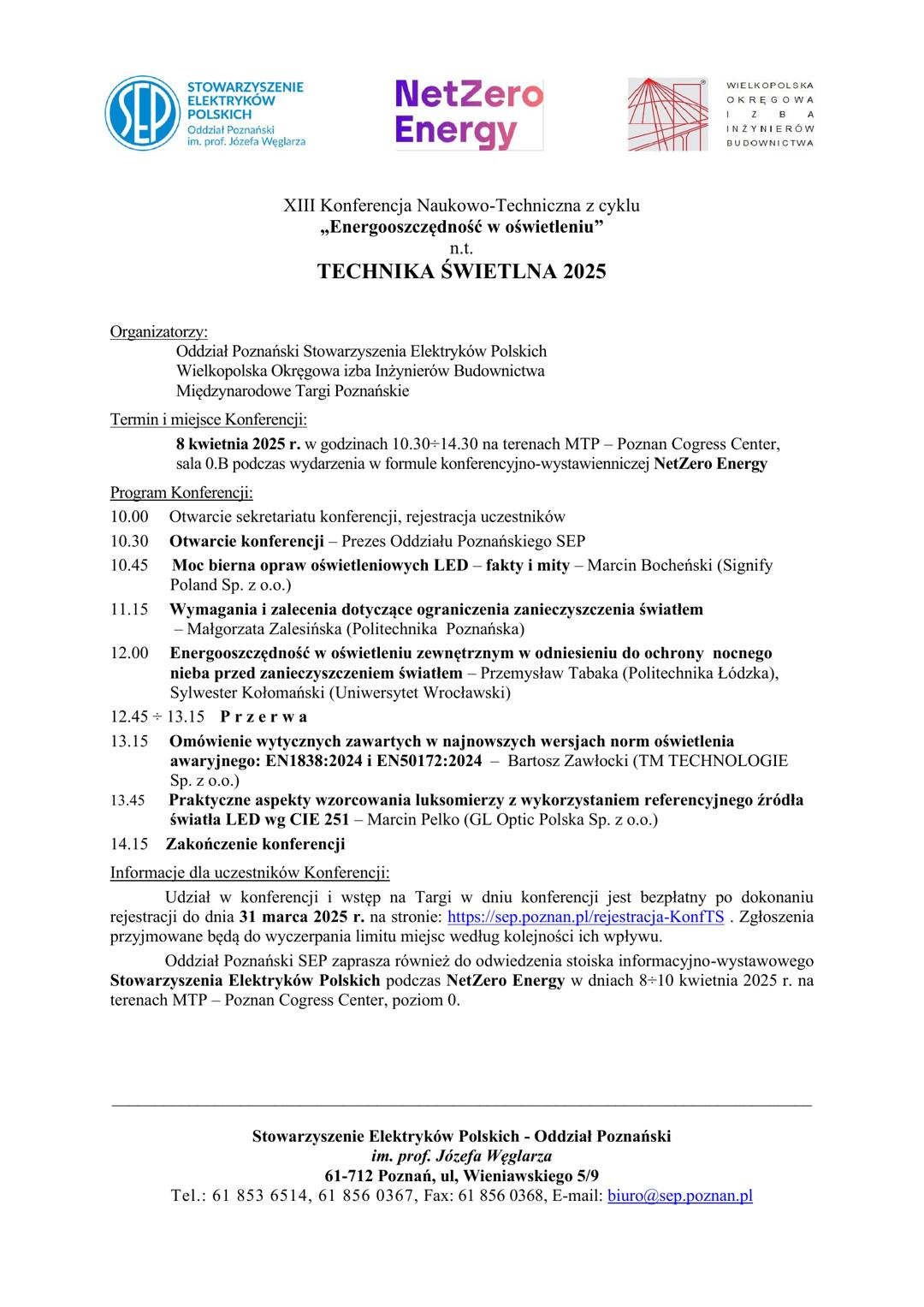 Oddział Poznański Stowarzyszenia Elektryków Polskich, Wielkopolska Okręgowa izba Inżynierów Budownictwa oraz Międzynarodowe Targi Poznańskie zapraszają do udziału w XIII Konferencji Naukowo-Technicznej z cyklu „Energooszczędność w oświetleniu” nt. TECHNIKA ŚWIETLNA 2025. Konferencja odbędzie się 8 kwietnia 2025 r. w godzinach 10.30÷14.30 na terenach MTP – Poznan Cogress Center, sala 0.B podczas wydarzenia w formule konferencyjno-wystawienniczej NetZero Energy.