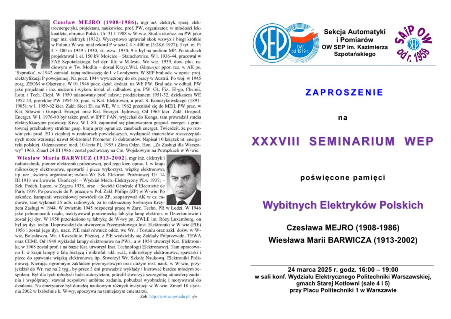 Zapraszamy do udziału w XXXVIII Seminarium WEP poświęconym pamięci Wybitych Elektryków Polskich: Czesława Mejro (1908-1986) i Wiesława Marii Barwicza (1913-2002). Seminarium odbędzie się 24 marca 2025 r., w godz. 16:00-19:00, w gmachu Starej Kotłowni (sale 4 i 5) przy Placu Politechniki 1 w Warszawie