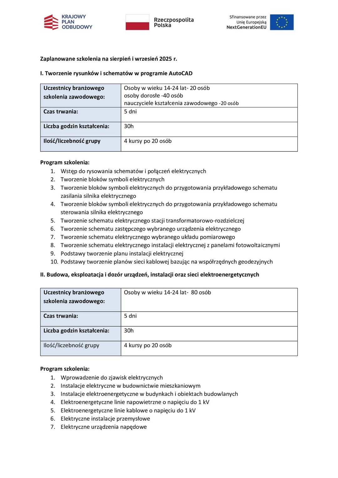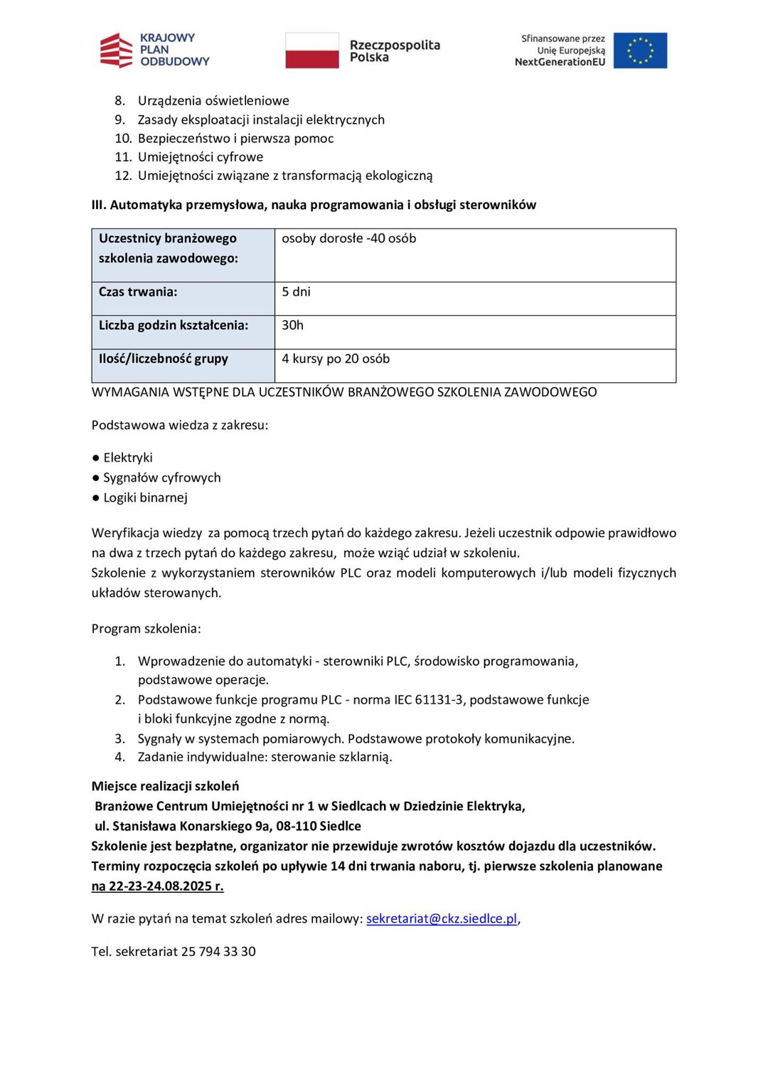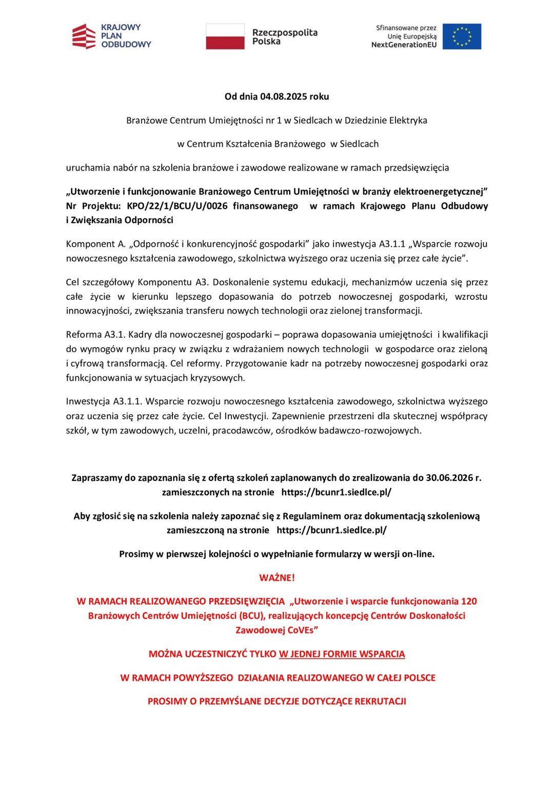 Branżowe Centrum Umiejętności nr 1 w Siedlcach w Dziedzinie Elektryka w Centrum Kształcenia Branżowego w Siedlcach uruchamia nabór na szkolenia branżowe i zawodowe realizowane w ramach przedsięwzięcia „Utworzenie i funkcjonowanie Branżowego Centrum Umiejętności w branży elektroenergetycznej” Nr Projektu: KPO/22/1/BCU/U/0026 finansowanego w ramach Krajowego Planu Odbudowy i Zwiększania Odporności.