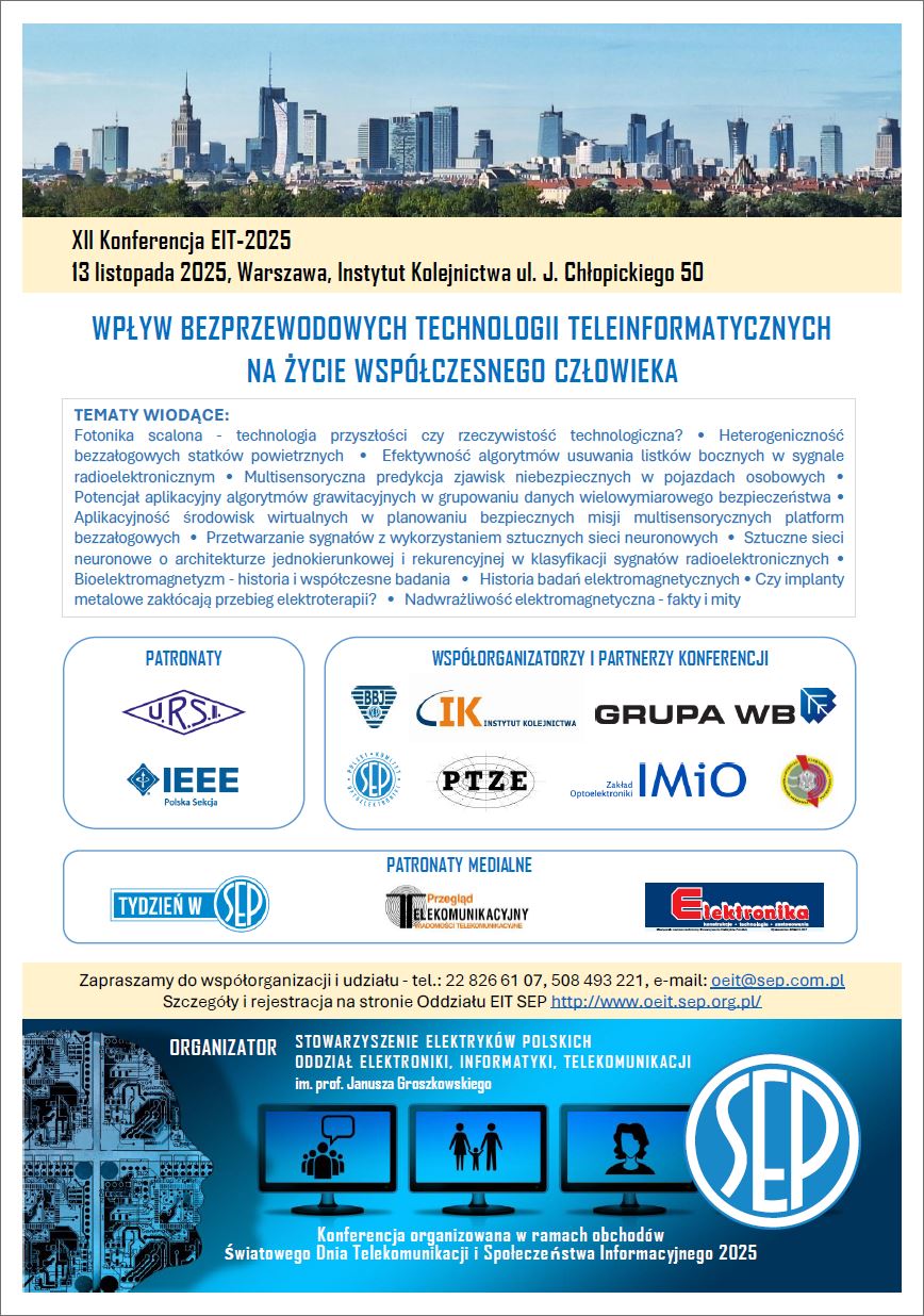 Oddział Elektroniki, Informatyki, Telekomunikacji SEP im. prof. Janusza Groszkowskiego zaprasza na XII KONFERENCJĘ EIT-2025 z cyklu „WPŁYW BEZPRZEWODOWYCH TECHNOLOGII TELEINFORMATYCZNYCH NA ŻYCIE WSPÓŁCZESNEGO CZŁOWIEKA”. Konferencja odbędzie się 13 listopada 2025 r. w Warszawie – Instytut Kolejnictwa, ul. J. Chłopickiego 50.