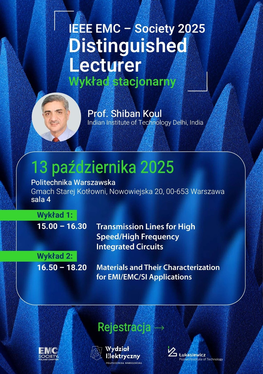 W imieniu organizatorów zapraszamy do uczestnictwa w wykładzie z cyklu „IEEE EMC Society Distinguished Lecturer Program”, który poprowadzi Profesor Shiban Koul (Indian Institute of Technology, Delhi, India). Wykład odbędzie się 13 października 2025 r. w Politechnice Warszawskiej, na kampusie głównym w Gmachu Starej Kotłowni w sali 4 (ul. Nowowiejska 20, 00-653 Warszawa).