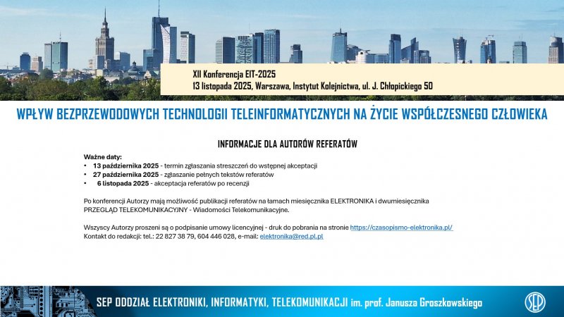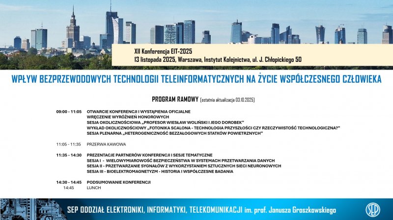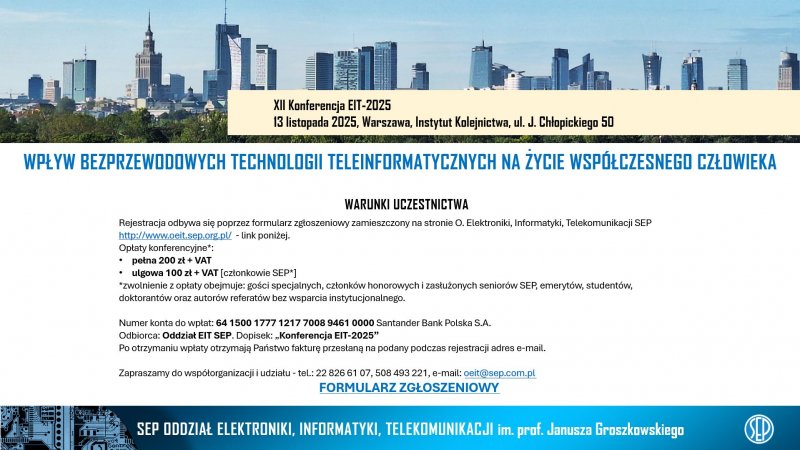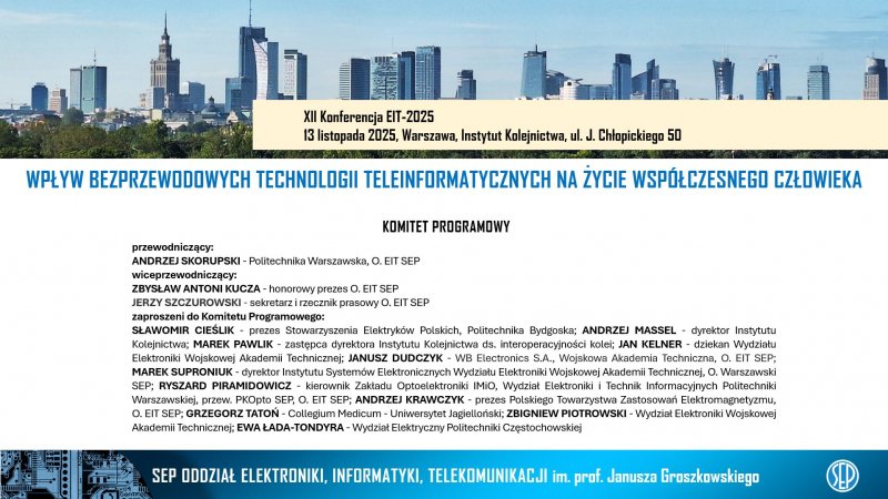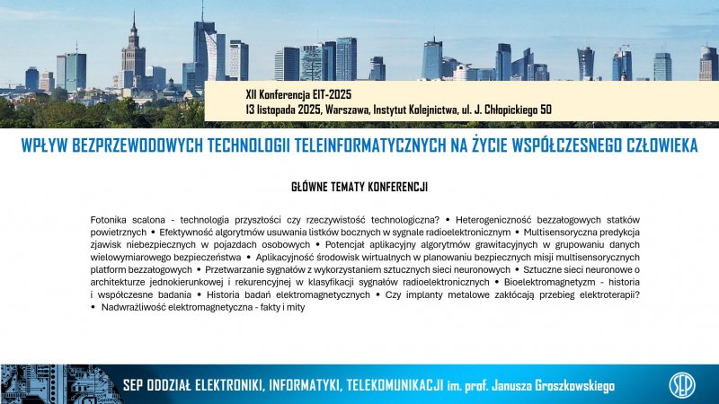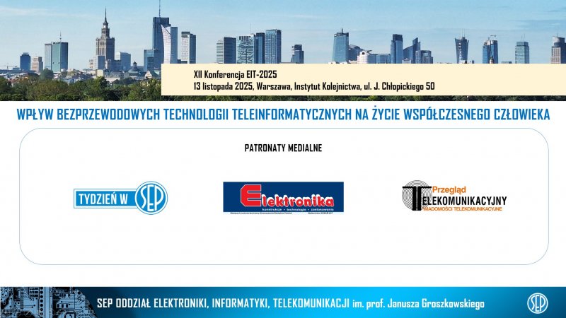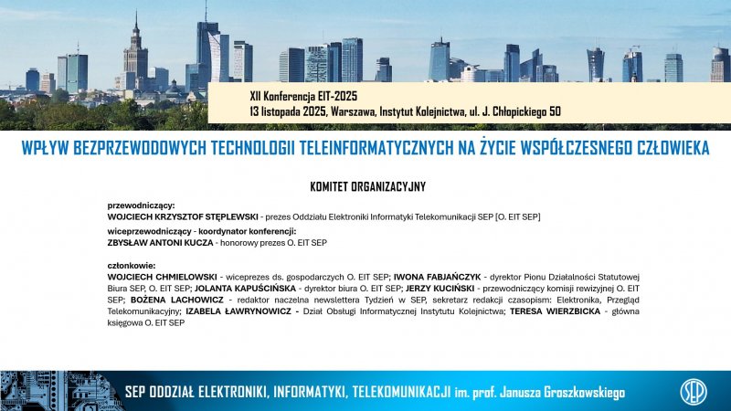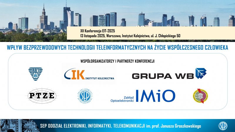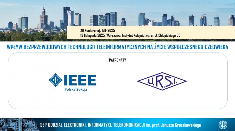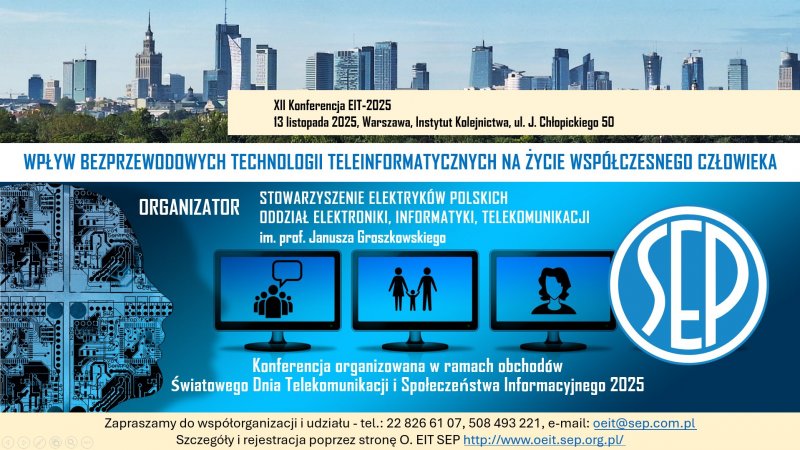 Oddział Elektroniki, Informatyki, Telekomunikacji SEP im. prof. Janusza Groszkowskiego zaprasza na XII KONFERENCJĘ EIT-2025 z cyklu „WPŁYW BEZPRZEWODOWYCH TECHNOLOGII TELEINFORMATYCZNYCH NA ŻYCIE WSPÓŁCZESNEGO CZŁOWIEKA”. Konferencja odbędzie się 13 listopada 2025 r. w Warszawie – Instytut Kolejnictwa, ul. J. Chłopickiego 50.