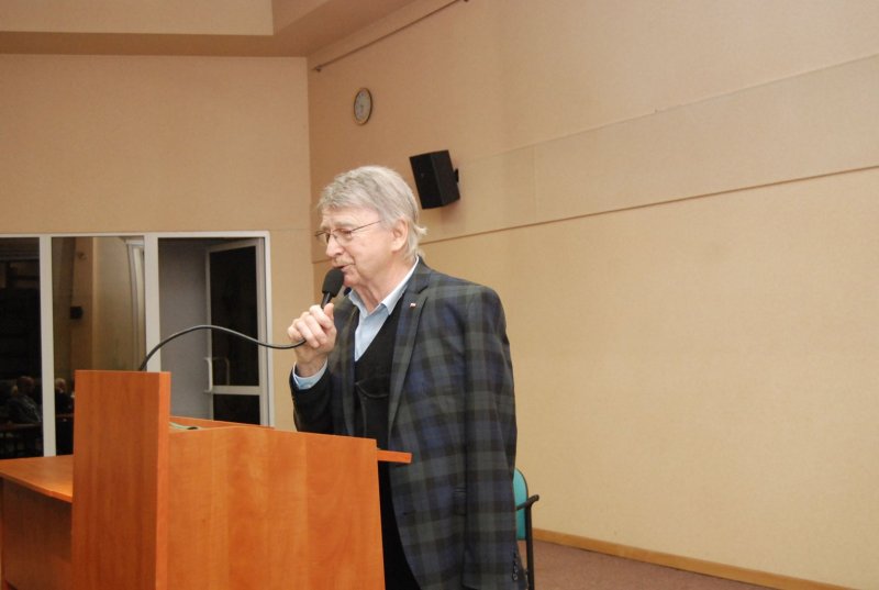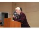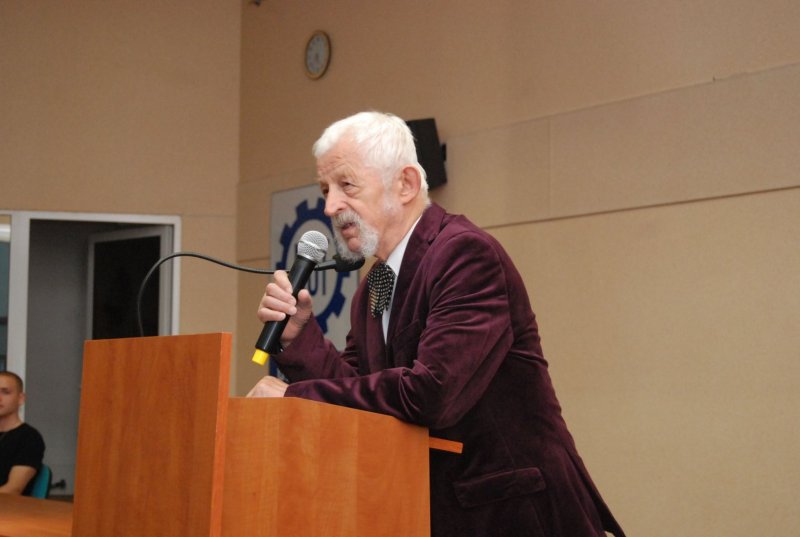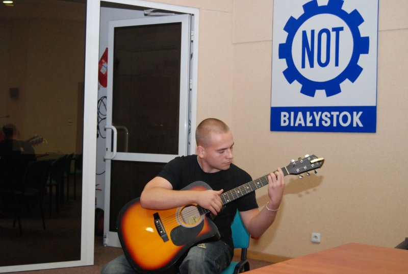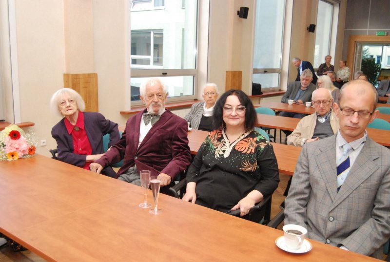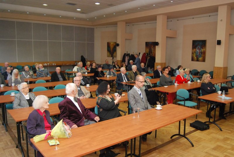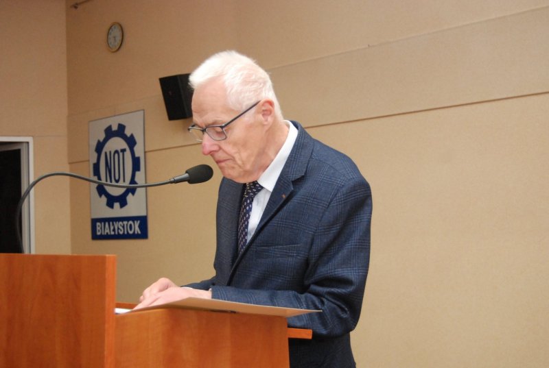 Po przecięciu wstęgi i okazjonalnej lampce szampana obecni przeszli do sali konferencyjnej na zasadniczą część wydarzenia. Tam zebranych powitał prezes Oddziału Białostockiego SEP kol. Paweł Mytnik podkreślając zasługi Profesora i zaprosił na chwilę muzycznego przerywnika w wykonaniu energetycznego gitarzysty Artura Szuberta (nazwisko zobowiązuje!), ucznia Zespołu Szkół Elektrycznych im. prof. Janusza Groszkowskiego w Białymstoku. Następnie specjalnie przygotowaną piękną laudację wygłosił kol. dr Jerzy Kołłątaj (też wychowanek profesora, były prezes Oddziału Białostockiego SEP w latach 1998-2026, obecnie członek Zarządu Oddziału), czym sprowokował prof. Kazimierza Cywińskiego do podziękowania i niezaplanowanej spontanicznej pięknej przemowy, w której Jubilat opowiedział wiele ciekawych faktów ze swego bogatego życia, a słuchacze przyjmowali to z zapartym tchem.