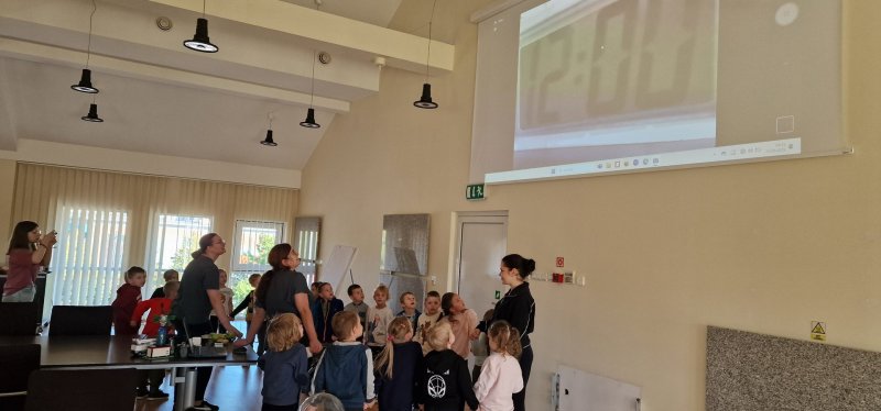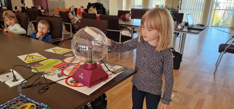 Na podstawie modeli elektrowni wiatrowej i słonecznej, omówiono zasadę działania odnawialnych źródeł energii elektrycznej. Za pomocą modelu generatora dzieci przeprowadziły eksperyment umożliwiający obserwację zmiany energii mechanicznej na elektryczną. Wytworzona energia elektryczna zasilała diodę LED dzięki czemu, widać świecącą diodę.