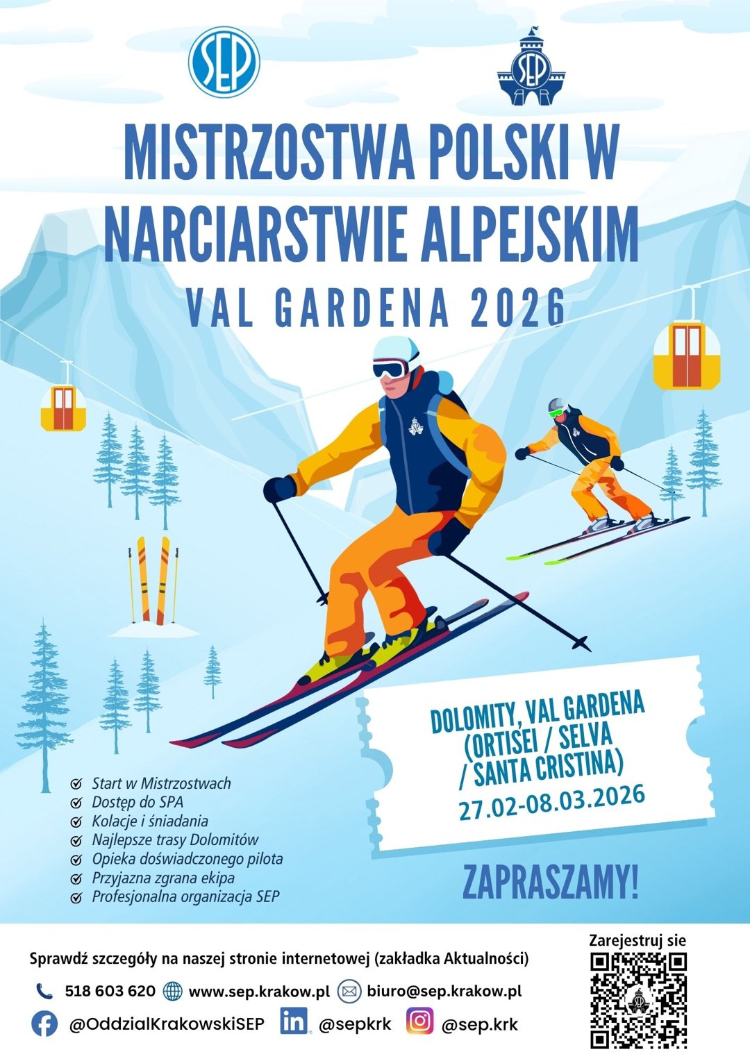 Oddział Krakowski SEP, we współpracy z Centralną Komisją ds. Sportu i Turystyki, ma zaszczyt zaprosić Państwa do udziału w XIII Mistrzostwach Polski SEP w Narciarstwie Alpejskim, które odbędą się w dniach 27 lutego – 8 marca 2026 roku w Dolomitach (Włochy).