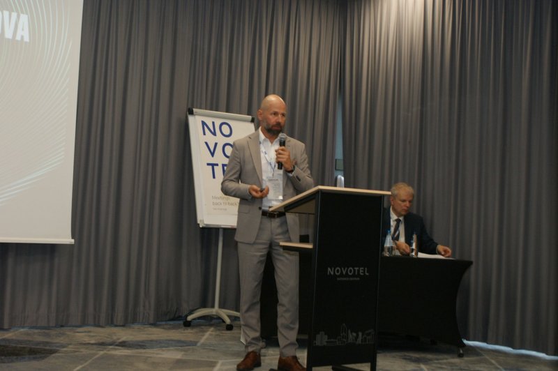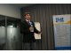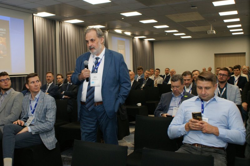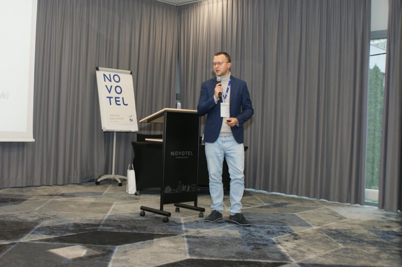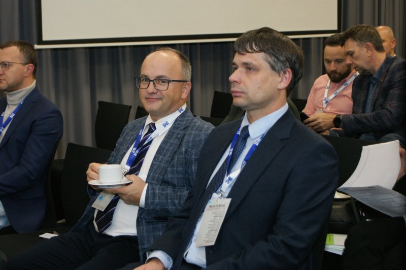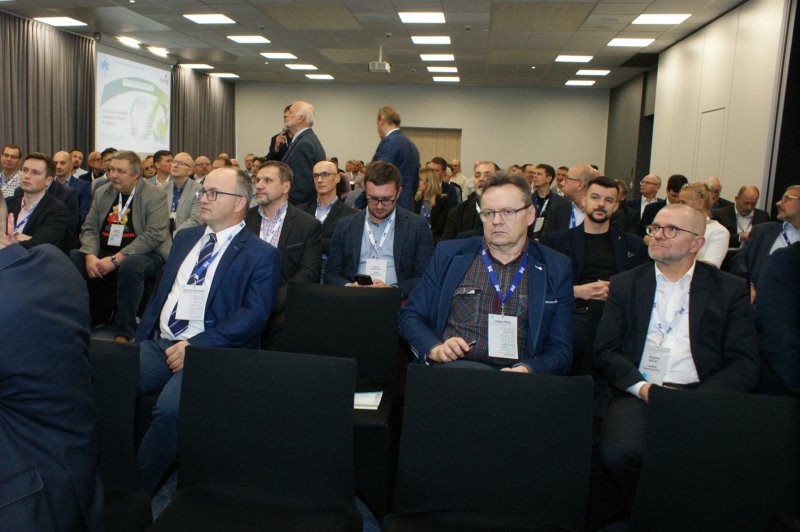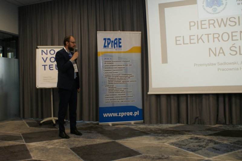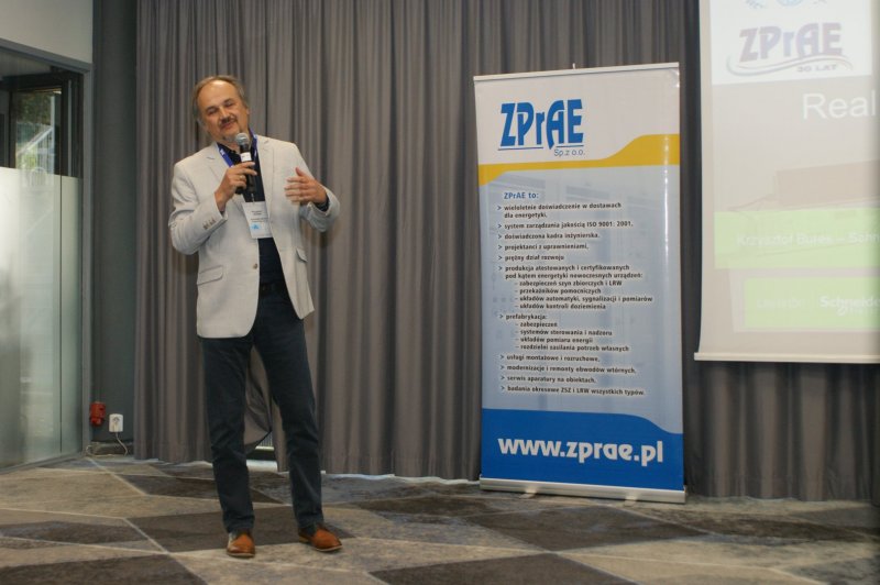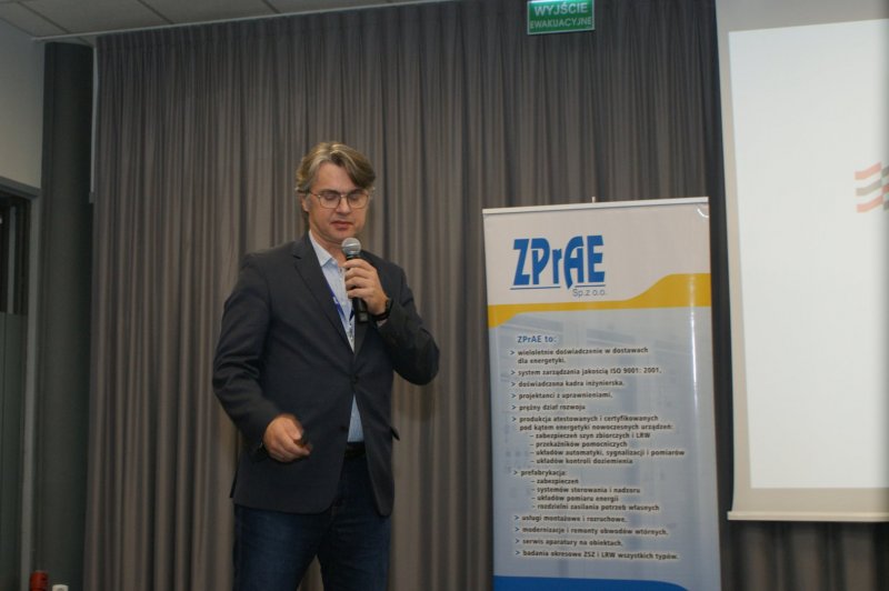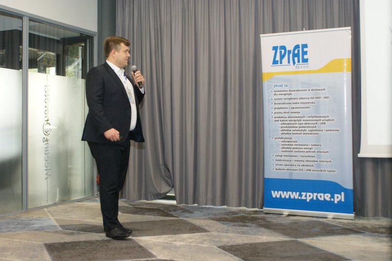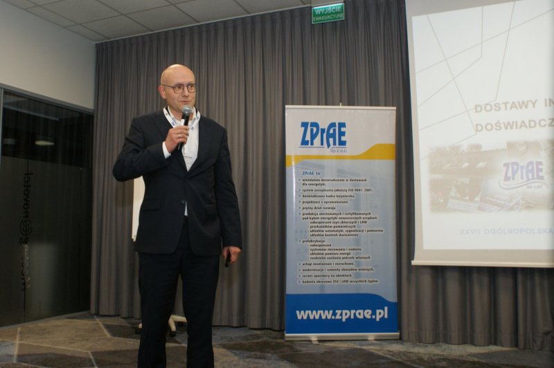 Następnie głos zabrał mgr Maciej Mańczak - Dyrektor Naczelny Zakładu Produkcyjnego Aparatury Elektrycznej. Powitał przybyłych na obrady uczestników, przedstawił historię powstania Zakładu, omówił aktualnie realizowane zadania oraz najbliższe plany rozwojowe, a także życzył owocnych obrad i ciekawych wrażeń podczas dyskusji kuluarowych.