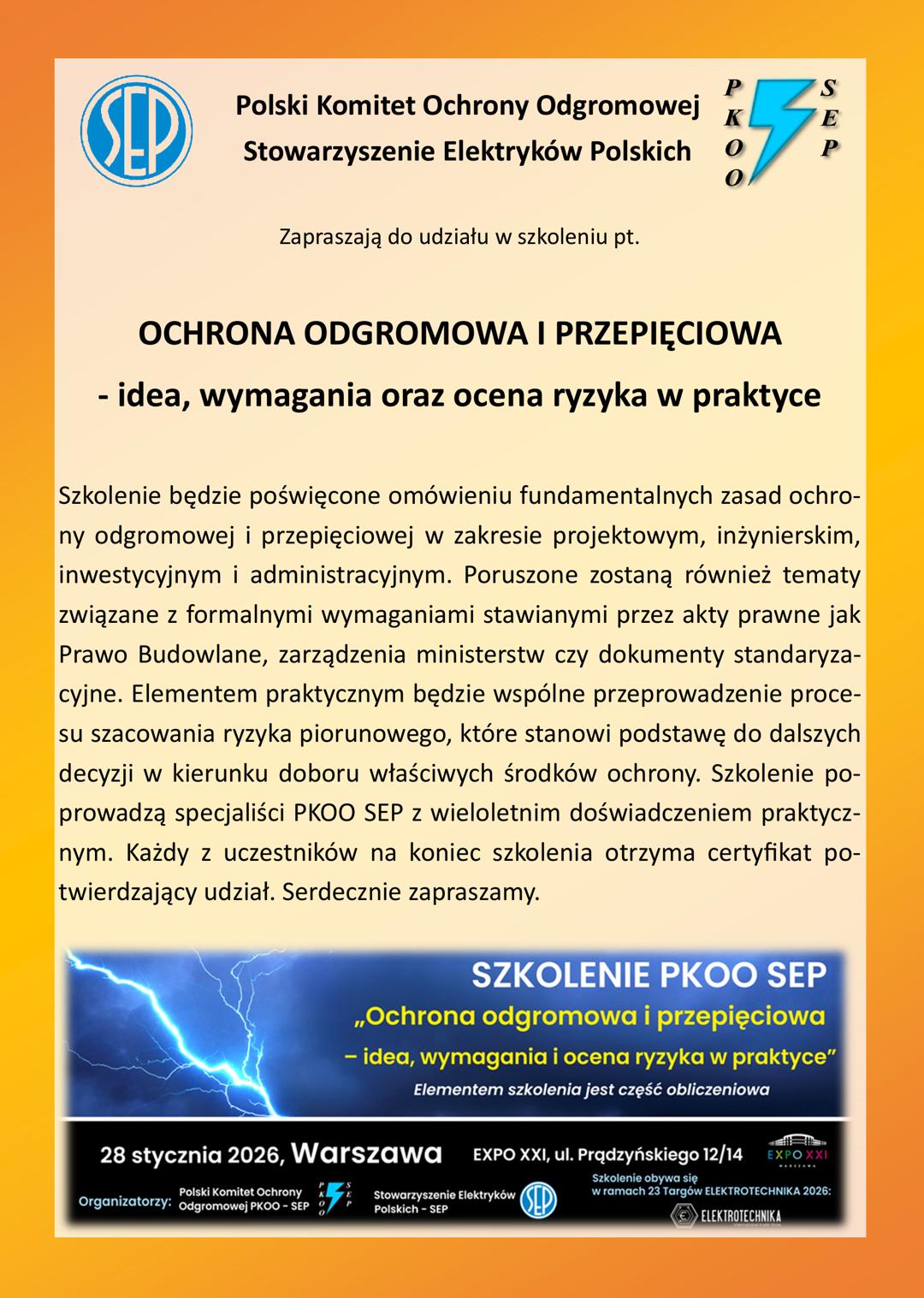 Polski Komitet Ochrony Odgromowej Stowarzyszenia Elektryków Polskich zaprasza do udziału w szkoleniu pt. „OCHRONA ODGROMOWA I PRZEPIĘCIOWA – idea, wymagania oraz ocena ryzyka w praktyce”, które odbędzie się 28 stycznia 2026 r. w Warszawie (EXPO XXI, ul. Prądzyńskiego 12/14), w ramach 23 Targów ELEKTROTECHNIKA 2026. Szkolenie będzie poświęcone omówieniu fundamentalnych zasad ochrony odgromowej i przepięciowej w zakresie projektowym, inżynierskim, inwestycyjnym i administracyjnym.